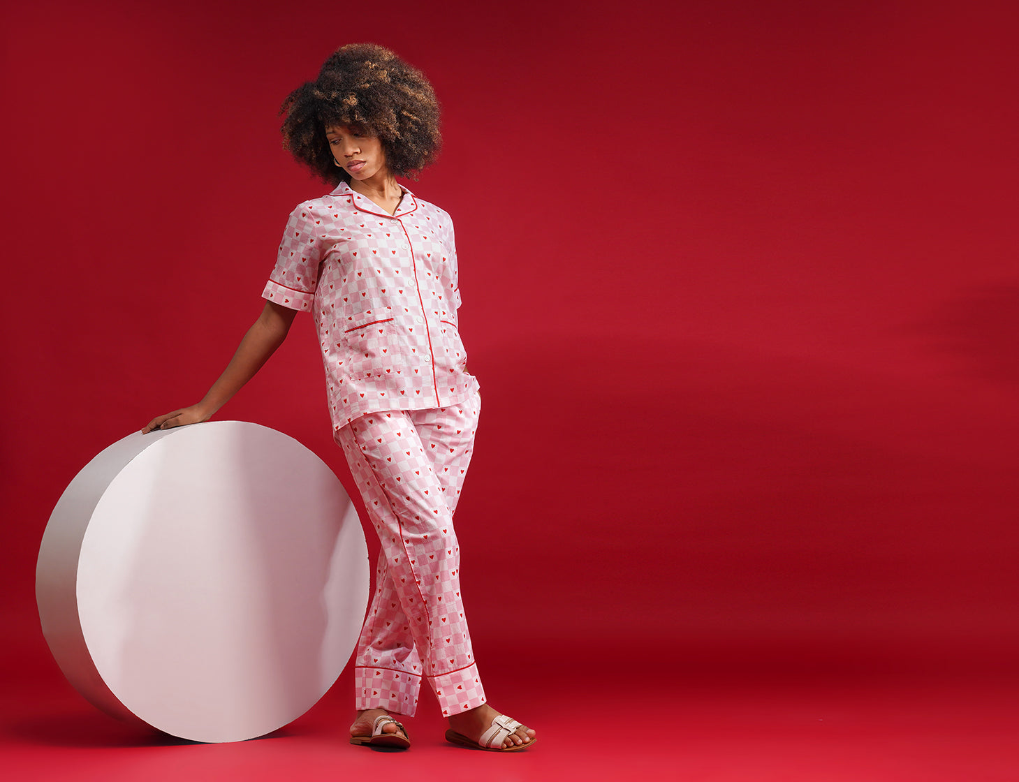 A soft swirl of pink-and-white checks meets charming red hearts in this cotton pajama set. Comfy, cozy, and sweet as candy — your bedtime just got a little cuter.