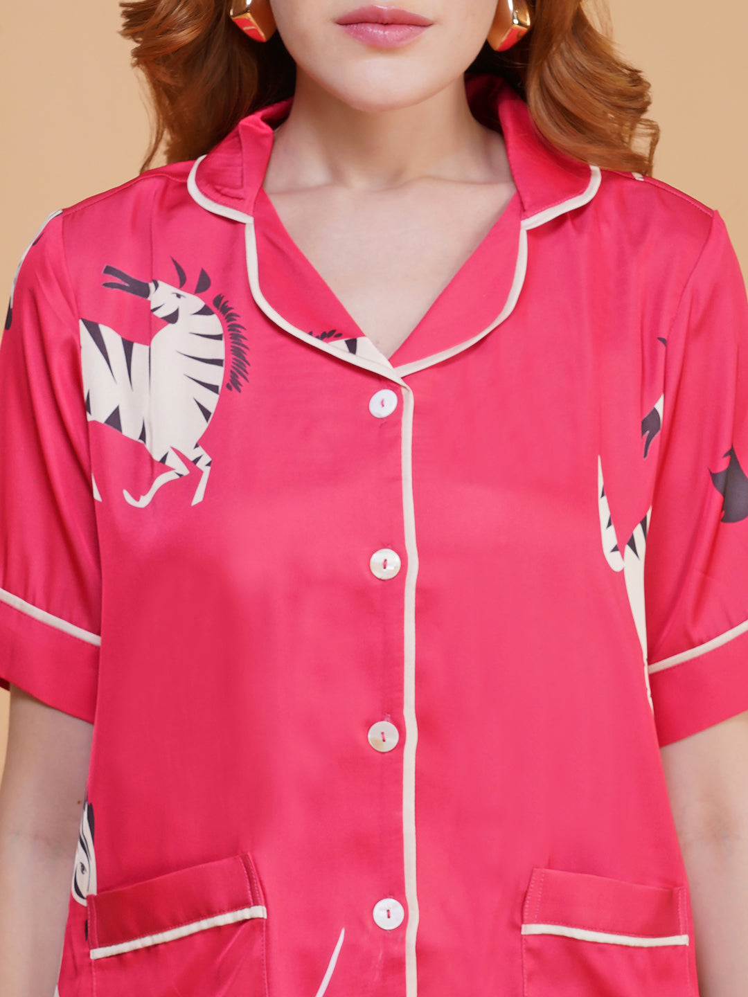 Whimsical meets chic in the Zebra Parade shorts set. The vibrant red satin and cheeky zebras make a joyful statement, while the easy, breezy silhouette keeps things light and comfy.